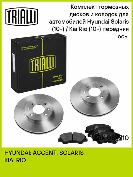 Комплект тормозных дисков и колодок для автомобилей Hyundai Solaris (10-) / Kia Rio (10-) передняя ось (диск тормозной 2 шт. + колодки тормозные 1 комплект) BK 084710 TRIALLI