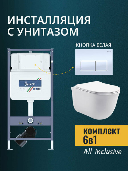 Инсталляция для подвесного унитаза Benneri 530 BE.53113.01 - Рама с антикоррозийным покрытием, окрашена порошковой эмалью - Высота монтажной рамы может регулироваться с помощью ножек до 20 см. Ножки изготовлены из нержавеющей стали - Сливной бачок скрытого монтажа изготовлен из современных полимерных материалов и является цельнолитым (бесшовным), что позволяет ему работать без протечек в течение всего периода эксплуатации - Специальный кожух из пенопласта защищает сливной бачок от возникновения конденсата и является дополнительной шумоизоляцией - Сервисное обслуживание осуществляется через окно бачка за клавишей смыва - Совместима со всеми видами подвесных унитазов, межосевое расстояние под крепежные шпильки унитаза 18 и 23 см - Двойной режим слива 3/6 литра с возможностью регулировки до 3/4,5 л - Гарантия на комплект составляет 10 лет, срок службы и эксплуатации до 50 лет Унитаз подвесной с сиденьем микролифт Aquatek Классик AQ1111-00 безободковый - Все изделия изготовлены из высококачественного глазурованного 100% санитарного фарфора - Безободковая конструкция чаши унитаза имеет улучшенную гигиеничность – нет труднодоступных мест для уборки и скопления бактерий - Благодаря системе быстрого демонтажа сиденье легко без лишних усилий демонтируется для удобства уборки - Дюропласт легок в уходе, устойчив к механическим повреждениям и чистящим средствам - Все унитазы Aquatek оснащены тонким сиденьем с функцией плавного закрывания Soft Close, благодаря автодоводчику крышка и сиденье опускаются плавно и бесшумно, без лишних контактов и усилий - Чаши унитазов Aquatek имеют форму, которая препятствует образованию брызг при использовании - Гарантия на керамику Aquatek -10 лет, на сиденье 2 года Кнопка смыва Benneri Luna BE.015A белая - Цвет: белый - Ширина, мм: 245 - Высота, мм: 165 - Глубина, мм: 12