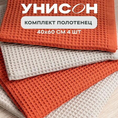Кухонные полотенца Унисон: комфорт и стиль на вашей кухне Вафельные полотенца Унисон изготовлены из 100% хлопка, что обеспечивает их мягкость и приятные тактильные ощущения. Полотенца Унисон прекрасно впитывают влагу, что делает их незаменимыми на кухне. Благодаря плотности ткани в 260 г/м2, они быстро сохнут и сохраняют свою форму даже после многократного использования. Кухонные полотенца Унисон выполнены в бежевом и тыквенном цветах, что позволяет им гармонично вписаться в любой интерьер кухни. Набор кухонных полотенец Унисон состоит из 4 штук размером 40х60 см. Выбирая кухонные полотенца Унисон, вы получаете не только функциональный, но и стильный аксессуар для вашей кухни.