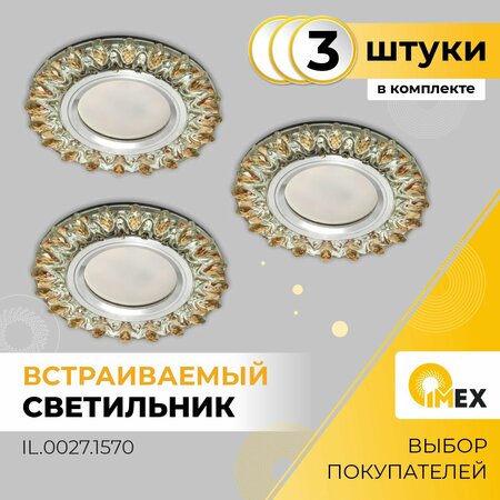 Комплект из 3-х шт. Светильник встраиваемый c декоративной светодиодной подсветкой арт. 3-IL.0027.1570 торговой марки IMEX. Стиль - модерн. Цвет плафона - прозрачный/желтый, цвет основания - хром. Предназначен для использования в помещениях с обычной влажностью. Площадь освещения - до 3 кв. м. Светильник имеет три режима работы: основной свет, декоративная подсветка и одновременное включение двух режимов. Подключается к двухклавишному выключателю для переключения режимов или к одноклавишному для одновременного включения. При отсутствии возможности подключить светильник к встроенному двухклавишному выключателю рекомендуем использовать радио выключатель RCS.590.58 или RCS.590.61. Рекомендуется использовать со светодиодной лампой 220D с цоколем GU5.3 мощностью 5Вт (лампа в комплект не входит). Светильник отлично подходит для освещения коридора, прихожей, гостиной, спальни. Декоративный плафон создает неповторимые световой узор на потолке. Пружинный механизм позволяет легко устанавливать светильник в натяжные и подвесные потолки, а также в гипсокартонные конструкции. Гарантия производителя 12 месяцев.