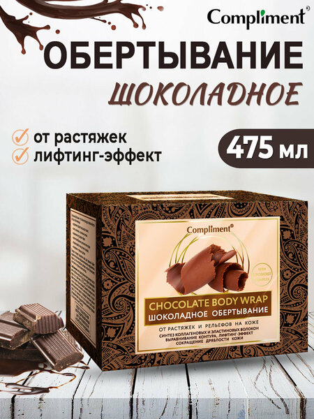 Compliment Обертывание шоколадное, 475 мл Compliment Body представляет шоколадное обертывание для тела, которое помогает избавиться от лишнего веса и улучшить состояние кожи. В его состав входят какао-бобы, кофеин и экстракт какао, которые способствуют уменьшению жировых отложений, улучшению кровообращения и укреплению кожи. Шоколадное обертывание также помогает уменьшить целлюлит и повысить тонус кожи, делая ее более упругой и гладкой. Использование шоколадного обертывания не требует особых навыков - достаточно нанести его на тело, обмотать пищевой пленкой и оставить на 20-30 минут, после чего смыть теплой водой. Регулярное использование этого продукта два-три раза в неделю поможет достичь наилучших результатов в борьбе с лишним весом и улучшении состояния кожи. Compliment Body шоколадное обертывание содержит только натуральные ингредиенты, не содержит вредных добавок и безопасно для использования. Compliment Body Chocolate Body Wrap - это шоколадное обертывание, которое поможет вам избавиться от лишних килограммов и улучшить состояние кожи тела. Этот продукт содержит множество полезных ингредиентов, таких как какао-бобы, кофеин, экстракт какао и другие. Эти компоненты помогают уменьшить жировые отложения, улучшить кровообращение и укрепить кожу тела. Кроме того, шоколадное обертывание может помочь уменьшить целлюлит и повысить тонус кожи.