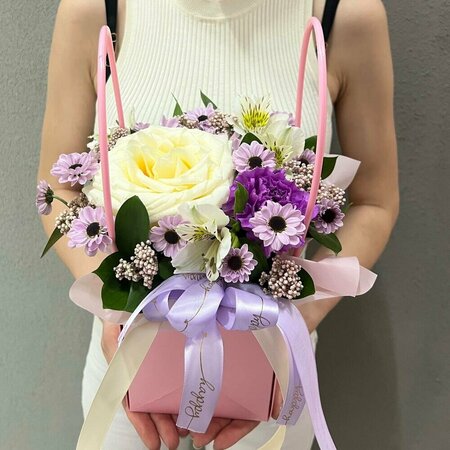 Внутри коробки вы найдете свежие цветы, включая элегантные хризантемы, которые известны своей долговечностью и яркими оттенками. Альстромерия добавляет композиции особый шарм благодаря своему разнообразию и выразительности, а пышная роза придает всему букету утонченность и изящество.