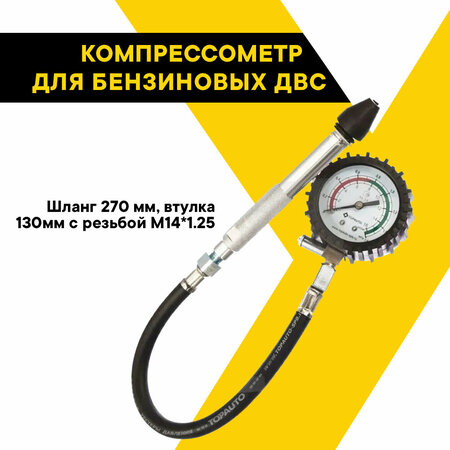 Компрессометр для бензиновых двигателей Топ Авто"Универсальный Бензиновый" совмещает возможности "Гибкого" (замеры без демонтажа оборудования), "Резьбового" (крепление в свечное отверстие с резьбой М14х1,25) и "Прижимного" (быстрый замер) компрессометров. Втулка вкручивается напрямую в манометр, если необходимо жесткое соединение. Универсальный компактный автомобильный компрессометр - манометр в резиновом чехле для измерения компрессии в бензиновых двигателях внутреннего сгорания: автомобильных, мотоциклетных, а также ДВС других транспортных средств. Измерения можно производить как с использованием резьбовой втулки компрессометра для автомобиля, так и с помощью прижимной резиновой втулки (обе входят в состав набора); наличие последней обеспечивает возможность проводить диагностику в том числе и ДВС с другими резьбами свечных отверстий. Упаковка - блистер.
