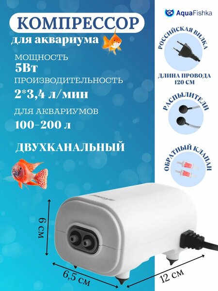 Компрессор YE - 921 (двухканальный). На компрессоре имеется регулятор мощности. Производительность 2х3,4л/м, напряжение - 220В/240В 50/60Hz, мощность: 3 Вт, для аквариумов до 200 л, размеры 12 см, ширина 7 см, высота 5 см. Размер с упаковкой 13,5см*9см*6см Вода ни в коем случае не должна попадать в компрессор, поэтому его необходимо размещать снаружи аквариума выше уровня воды. Такой способ позволяет избежать попадания воды в систему и замыкания электропроводки. При установке компрессора ниже уровня воды, обязательно нужно использовать обратный клапан. Это исключит обратный ток воды. Бесшумный компрессор эффективно справляется с аэрацией воды в пресноводных и морских аквариумах до 100 литров, а также водных террариумах с рептилиями. Кроме того, воздушный компрессор может применяться в качестве привода аэрлифтных и донных фильтров. Компрессор с набором шлангов для подключения и распылителем обеспечивает мощный поток воздуха, который быстро насыщает воду кислородом, тем самым создавая комфортные условия для аквариумных рыбок. Компрессор эффективно справляется с аэрацией воды в пресноводных и морских аквариумах до 200 литров, а также водных террариумах с рептилиями. Кроме того, воздушный компрессор может применяться в качестве привода аэрлифтных и донных фильтров. Компрессор для аквариума обеспечивает надежную и бесперебойную аэрацию в аквариуме. Компрессор обеспечивает мощный поток воздуха, который быстро насыщает воду кислородом, тем самым создавая комфортные условия для аквариумных рыбок. С набором аксессуаров, включающим шланг, два распылителя, два обратных клапана и два краника аэратор полностью готов к эксплуатации. Компрессор двухканальный, что позволяет использовать его одновременно в двух аквариумах.