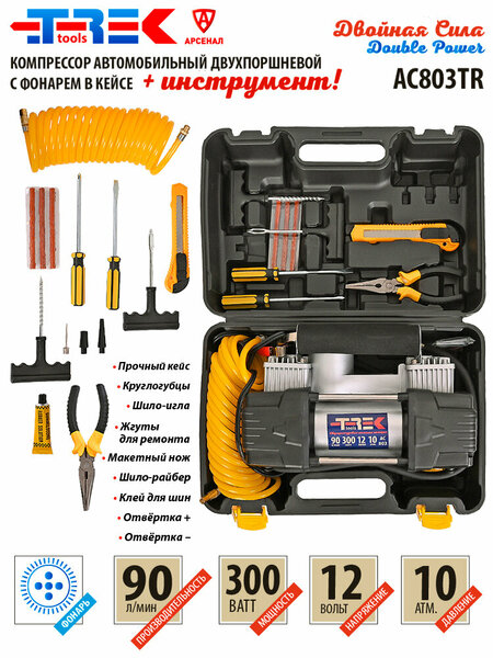 Двухпоршневой компрессор с фонарем в кейсе с дополнительными интрументами. Напряжение 12 В, с подключением зажимами ("крокодилы") к АКБ Длина провода - 2,7 м Длина шланга - 80 см + витой жёлтый шланг - 2,5 м = 3,3м Примерная длина доступа около 6 метров Мощность - 300 Вт Макс. давление до 10 атм/100 psi. Производительность при напряжении 13,8 В 90 л/мин. Непрерывная работа компрессора не более 15 минут В комплекте 3 дополнительные насадки Размер упаковки - 35х24х14 см Вес - 3,2 кг В набор входит: 1. Автомобильный компрессор с фонарем 2. Кейс для хранения 3. Набор насадок - 3шт. 4. Клей для заклеивания шин - 30мл. 5. Набор жгутов - 3 шт. 6. Отвертка крестовая - 1 шт. 7. Отвертка плоская - 1шт. 8. Канцелярский нож - 1шт. 9. Пассатижи - 1 шт. 10. Инструмент для подготовки прокола - 1 шт. 11. Инструмент для установки жгута - 1шт. Компрессор является незаменимым помощником автомобилиста, а также будет полезен на даче или пикнике, так как в комплекте имеются различные переходники для накачивания надувных матрасов, резиновых лодок, мячей, тюбингов, колясок.
