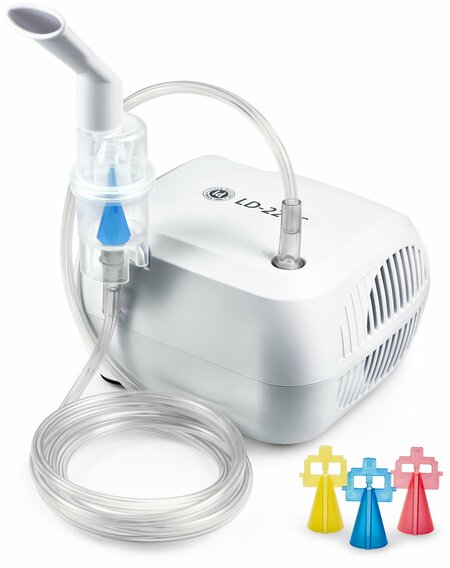 Компрессорный ингалятор. Новая конструкция небулайзера с тремя режимами ингаляции. Самая компактная модель компрессорных ингаляторов LD. Особенности модели: • Активируемый вдохом небулайзер. Специальная конструкция небулайзера определяет разные пути воздушных потоков при вдохе и выдохе. • Максимально эффективное использование лекарственных средств благодаря низкому остаточному объему ингаляционного раствора. • Возможность использования с широким спектром лекарственных средств. • Гарантия 3 года. • Максимально полная комплектация: 2 ингаляционные маски (взрослая и детская), 2 мундштука, 2 назальные насадки (взрослая и детская), воздушная трубка длиной 2м, 5 сменных воздушных фильтров. • Три режима работы небулайзера, переключаемые нажатием кнопки: – режим 1 – преимущественно для нижних отделов (например: бронхит и бронхиальная астма), – режим 2 – универсальный. – режим 3 – преимущественно для верхних отделов (например: синусит, ларингит, трахеит, ОРВИ),
