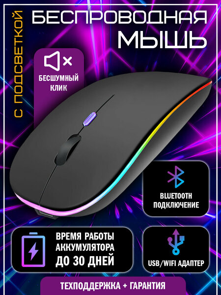 Мышь беспроводная бесшумная с RGB подсветкой случайных цветов, эргономичный дизайн. Управляемый DPI 800-1600.Длительное время автономной работы до 168 часов.