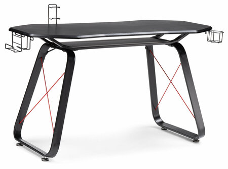 Поверхность столешницы покрыта пленкой под карбон. Стол оснащен подстаканником, крючком для наушников и универсальным держателем. Расстояние между ножками: 82 см. Высота до полки: 65 см. Высота от полки до столешницы: 6 см. Длина полки: 70 см. Глубина полки:25 см. Толщина столешницы: 2 см.