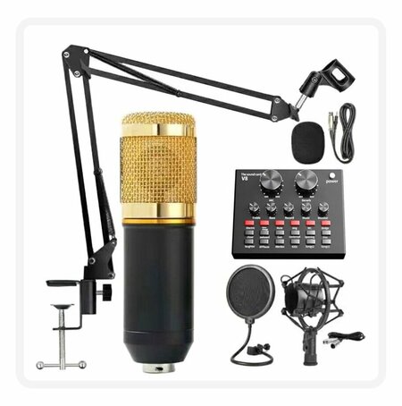 Микрофон, микшер,кабель XLR -Jack 3,5 мм, ветрозащита, поп фильтр, держатель для микрофона типа "паук" настольная коленчатая стойка для микрофона, USB адаптер для подключения наушников и микрофона, инструкция