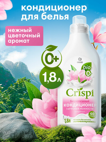 Биоразлагаемый кондиционер для стирки белья CRISPI Гармония нежности 1.8 л от Grass на 60 стирок - представляет собой универсальный высокоэффективный гипоаллергенный ополаскиватель с изысканным ароматом цветов розового жасмина и древесными нотами. Идеально подходит для стирки детской одежды и вещей новорожденных (0+), а также черного, темного, белого и цветного белья, применим для всех типов ткани. Полностью вымывается, не оставляя разводов и следов на одежде или белье, сохраняет структуру и цвет, обладает антистатическим эффектом. За счёт входящих в состав компонентов на основе масла кокоса и пальмы - облегчает глажку одежды после стирки, придаёт вещам мягкость и свежий аромат. Подходит для всех типов стиральных машин, безопасен для септика. Способ применения: 1. Тщательно взболтайте флакон. 2. Для автоматической стирки - налейте 30мл средства в выдвижной отсек стиральной машины. 3. Для ручной стирки - полностью растворите в воде для полоскания. Бытовая химия Эко Криспи - это незаменимые помощники в деле любой уборки. С нашими средствами из линейки грасс - ваша стирка белья преобразится в многоплановый, интересный процесс, подарив комплексный уход и приятный аромат всем вашим вещам!