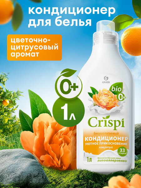 Биоразлагаемый кондиционер для стирки белья CRISPI Уютное прикосновение 1л от Grass на 33 стирки - представляет собой универсальный гипоаллергенный высокоэффективный ополаскиватель с изысканным ароматом бутонов пиона, белых цветов и цитрусовыми нотами. Идеально подходит для стирки детской одежды и вещей новорожденных (0+), а также черного, темного, белого и цветного белья, применим для всех типов ткани. Полностью вымывается, не оставляя разводов и следов на одежде или белье, сохраняет структуру и цвет, обладает антистатическим эффектом. За счёт входящих в состав компонентов на основе масла кокоса и пальмы - облегчает глажку одежды после стирки, придаёт вещам мягкость и свежий аромат. Подходит для всех типов стиральных машин, безопасен для септика. Способ применения: 1. Тщательно взболтайте флакон. 2. Для автоматической стирки - налейте 30мл средства в выдвижной отсек стиральной машины. 3. Для ручной стирки - полностью растворите в воде для полоскания. Бытовая химия Эко Криспи - это незаменимые помощники в деле любой уборки. С нашими средствами из линейки грасс - ваша стирка белья преобразится в многоплановый, интересный процесс, подарив комплексный уход и приятный аромат всем вашим вещам!