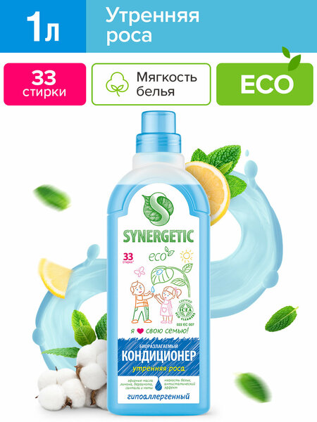 Биоразлагаемый кондиционер-ополаскиватель для белья SYNERGETIC "Утренняя роса" – высокоэффективное средство, бережно ухаживающее за всеми типами ткани, в том числе деликатными, и придающее особую мягкость и нежность белью после стирки. Гипоаллергенный кондиционер-ополаскиватель нейтрализует остатки средств для стирки на ткани, помогает сохранить структуру ткани, защищая волокна от изнашивания и повреждения. Средство обладает антистатическим эффектом. Комплекс растительных К-тензидов обеспечивает легкую глажку белья после стирки и высыхания. Гипоаллергенная парфюмерная композиция с эфирными маслами лимона, бергамота, сантала и мяты придает белью свежий аромат. Подходит для ручной и машинной стирки, полностью выполаскивается из тканей. Международный экологический сертификат ICEA подтверждает биоразлагаемость, безопасность и эффективность средства. Биоразлагаемые компоненты не вредят микрофлоре септических установок. Подготовленная вода > 30%; К-тензиды (ПАВ из растительного масла) 5–15%; парфюмерная композиция с эфирными маслами лимона, бергамота, сантала и мяты; пищевой краситель.