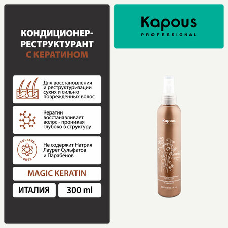 Кондиционер-реструктурант с кератином Kapous «Magic Keratin» - это профессиональное средство для ухода за волосами, разработанное японским брендом Kapous Professional. Основным активным компонентом кондиционера является кератин, который проникает глубоко в структуру волоса и достраивает поврежденные перемычки, делая волосы более сильными и блестящими. Высокоактивные компоненты кондиционера активизируют регенеративные процессы в волосах, смягчают и восстанавливают поврежденные слои, положительно влияют на синтез кератина, что повышает упругость и эластичность волос. Кондиционер предназначен для восстановления и реструктуризации сухих и сильно поврежденных волос, а также для защиты и ухода за ними. Он подходит для окрашенных волос и может использоваться в комплексе с другими средствами линии Kapous с кератином для достижения максимального результата. Кондиционер-реструктурант с кератином Kapous «Magic Keratin» имеет удобный дозатор, что обеспечивает экономичное использование продукта. Объем составляет 300 мл Kapous Professional - это бренд, который зарекомендовал себя на рынке профессиональной косметики для волос. Продукция компании не тестируется на животных, не содержит продуктов животного происхождения и имеет сертификат «Fragrance free», что означает отсутствие парфюмированных добавок. В целом, кондиционер-реструктурант с кератином Kapous «Magic Keratin» является отличным выбором для тех, кто ищет профессиональное средство для ухода за волосами, которое поможет восстановить их структуру, укрепить и придать здоровый вид.