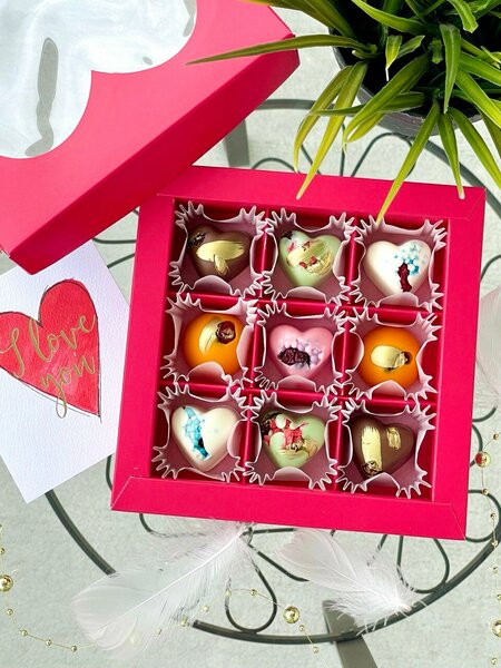 "Мое сердце там. где ТЫ" Красивый набор конфет ручной работы из Бельгийского шоколада La Moon поднимет настроение любой девушке, любому мужчине, любой маме, любому папе и абсолютно любому, кто любит вкуснейший шоколад и цельные орехи. Упаковано в изящную красную коробочку с окном в виде сердца с атласной лентой. Идеально подойдет на День Рождения, для любого события или просто в качестве знака внимания. В составе коробочки 9 конфет ручной работы из 5 вкусов молочного, белого, апельсинового, рубинового и лимонного Бельгийского шоколада. Внутри конфет сушеная клюква, цельный фундук или миндаль или кешью, тыквенные семечки, сублимированные ягоды и воздушный рис. Сверху конфеты украшены золотым пищевым кандурином. Вес шоколада в наборе- 90 грамм Хранить шоколад лучше всего в сухом прохладном месте при температуре +18+23С, подальше от солнечных лучей и нагревательных приборов на кухне (чайник, плита, тостер).