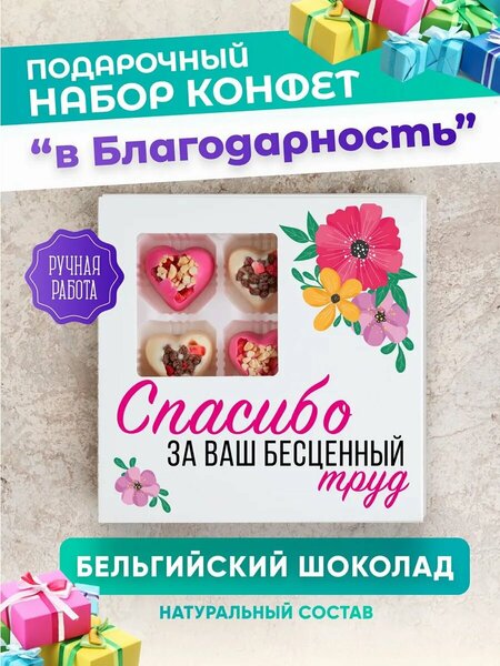 Хотите выразить свою благодарность и признательность близким, коллеге , врачу , родителям , учителю, няне или воспитателю, бухгалтеру ? Мы знаем, как сделать это особенным и незабываемым! Представляем вам наш прекрасный подарочный набор из 9 конфет "Спасибо"! Конфеты "Спасибо" - это не просто сладости, они являются особенным символом вашей признательности . Когда вы дарите этот подарок тренеру, хореографу или классному руководителю на выпускной, учителю на день рождения, куратору - вы дарите частичку своей любви и благодарности. Будь то психолог, логопед, стоматолог гинеколог или косметолог- этот презент станет для них настоящим сокровищем. Мы изготавливаем конфеты доктору из лучших сортов белого, молочного и темного шоколада. Используем яркую упаковку, которая станет настоящим украшением праздника для нянечке, музыкального руководителя или директору школы. Для первого учителя, преподавателя, заведующей детского сада на день знаний или сладости в подарок медику, пожарному – каждый найдет подходящий вариант. Если вы ищете эксклюзивно вкусное для инструктора по вождению, мы рекомендуем боксы со сладостями, которые точно понравятся всем. Подарочные наборы продуктов– это настоящий сюрприз на важные даты – день учителя, день воспитателя, выпускной, последний звонок или просто важный повод. Удивите и выразите свою благодарность вкуснейшим подарком для учителя на выпускной– заказывайте наши шоколадки прямо сейчас!