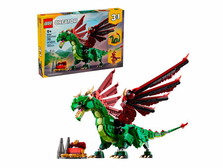 Порадуйте своего маленького путешественника во времени игровым набором LEGO CREATOR «Средневековый дракон» (31161). В набор входит фигурка дракона, которая позволяет мальчикам и девочкам в возрасте от 9 лет и старше разыгрывать захватывающие средневековые приключения, пара больших подвижных крыльев двигаются вверх и вниз, складываются и раскладываются, а также подвижные конечности, шея, челюсть и плечи. В комплект входит сундук с сокровищами для дополнительной игровой ценности. • Конструктор LEGO CREATOR «Средневековый дракон» (31161) позволит мальчикам и девочкам в возрасте от 9 лет и старше собирать и перестраивать 3 разных фантастических животных, используя детали из одного набора. • Любители мифических животных смогут создавать и разыгрывать средневековые приключения с драконом, морским змеем или фениксом. • Безграничные возможности для игры – все 3 сборки с высокой степенью детализации имеют подвижные части тела, поэтому дети могут наслаждаться творческой игрой, ставя их в разные положения. • Прекрасный экспонат для игры и демонстрации. Сборку можно выставить на полке или прикроватном столике после игры, а феникс идет в комплекте с аутентичной подставкой из кубиков. • Идея подарка – побалуйте себя или подарите эту сборную модель на день рождения, праздник или в качестве особого сюрприза. • Размеры — этот набор животных LEGO, состоящий из 715 деталей, включает в себя дракона размером более 13 см в высоту, 39 см в длину и 52 см в ширину.