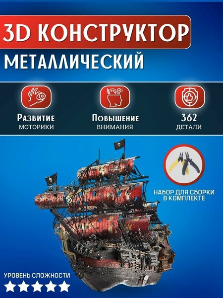 Откройте мир увлекательного творчества с металлическим конструктором, который станет превосходным вариантом для совместного времяпрепровождения детей и родителей. Это потрясающие 3D-наборы из металла. Просто выдавите вырезанные лазером детали из металлического листа и соедините их без клея. Этот конструктор 3Д для мальчиков не только развивает моторику и воображение, помогает снять стресс и расслабиться, отвлекает от гаджетов, но и позволяет создавать оригинальные трехмерные фигуры прямо у себя дома. Конструктор состоит из 362 деталей, которые легко соединяются, обеспечивая интересный процесс моделирования. С помощью этого 3D конструктора вы сможете собрать реальный макет Пиратского Корабля. Модель для сборки будет интересна как детям, так и взрослым, ведь это отличный подарок на любой праздник, который никого не оставит равнодушным. 3D пазл предоставляет возможность не только насладиться процессом сборки, но и получить радость от готового изделия. Каждый элемент конструкции продуман до мелочей, что подчеркивает элегантность и реализм итогового результата. В комплект входит необходимый набор для сборки: кусачки и длиногубцы. Уровень сложности сборки составляет 5 звезд, что делает его идеальным выбором для опытных моделистов, которые не ищут легких путей. В собранном виде модель выглядит очень эффектно, станет достойным украшением рабочего стола, книжной полки или камина. Занимайтесь творчеством вместе с вашим ребенком и открывайте новые горизонты в мире 3Д конструкторов! Создание такого произведения искусств требует терпения и внимательности, но результат вас приятно удивит. Погрузитесь в процесс и получите удовольствие от творчества. Не упустите возможность приобрести эту замечательную сборную модель корабля, которая вдохновит и повысит способность вашего ребенка планировать и строить конструкции, как настоящий архитектор или инженер!