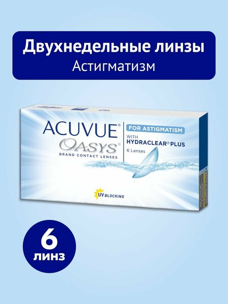 ACUVUE OASYS for Astigmatism with HYDRACLEAR PLUS обеспечивают непревзойденный комфорт в течение всего дня благодаря ультрагладкой поверхности, контактные линзы практически не ощущаются на глазах. Благодаря технологии HYDRACLEAR PLUS в контактные линзы введен материал, который удерживает и притягивает влагу, стабилизирует слёзную плёнку и обеспечивает комфорт. В контактных линзах ACUVUE OASYS for Astigmatism with HYDRACLEAR PLUS используется принцип стабилизации веками: при моргании линза сама выравнивается на глазу, принимая правильное положение, благодаря чему зрение может остаться чётким и стабильным независимо от ваших движений. Также линзы помогают обеспечить защиту от вредного УФ излучения.