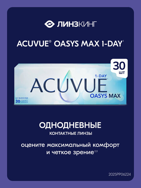 Устаете от размытых контуров и нечеткого изображения? Хотите увидеть мир ярче и четче? Контактные линзы – это удобство и свобода, которые позволят наслаждаться жизнью без ограничений. Не откладывайте заботу о своем зрении на потом – проверьте зрение и попробуйте контактные линзы уже сегодня! Контактные линзы ACUVUE® предназначены для коррекции различных нарушений зрения: близорукости, дальнозоркости, астигматизма, пресбиопии. ACUVUE® производятся в США и Ирландии компанией Johnson & Johnson, одним из мировых лидеров в сфере здравоохранения. Более 35 лет научных и технологических разработок позволяют ACUVUE® предложить контактные линзы высочайшего качества, чтобы помочь вам видеть, общаться и жить лучше. ACUVUE® представлены несколькими продуктовыми линейками, что позволит выбрать наиболее подходящий вариант именно для вас. ACUVUE® OASYS MAX 1-Day* Жизнь меняется, а нагрузка на глаза растет. Если вы хотите видеть и жить на максимум, попробуйте нашу последнюю инновацию – однодневные контактные линзы ACUVUE® OASYS MAX 1-Day*. Они сочетают в себе 2 новые технологии для максимального комфорта и чёткого зрения1**. ACUVUE® OASYS MAX 1-Day* доступны в упаковке 30 линз и предназначены для коррекции близорукости и дальнозоркости. Ключевые преимущества Откройте для себя лучшие линзы ACUVUE®2! • максимальный КОМФОРТ1** Технология увлажнения TearStable® уменьшает испарение влаги с поверхности линзы3,4***, чтобы комфорт оставался с вами в течение всего дня, даже при длительном использовании гаджетов1. • максимальная ЧЕТКОСТЬ1** Фильтр OptiBlue**** частично фильтрует синий свет и уменьшает блики и ореолы3,4***, чтобы картинка оставалась чeткой и яркой при разном уровне освещенности и за экранами цифровых устройств1. • до 100% КИСЛОРОДА5 ACUVUE® OASYS MAX 1-Day* позволяют глазам «дышать» – как будто не носите линзы. • защита от УФ-ЛУЧЕЙ4^ УФ-фильтр 1 класса помогает защитить глаза от вредного излучения. • ежедневная замена Однодневные линзы предназначены для одноразового использования и очень удобны, если хочется избежать забот по очистке и хранению линз после каждого использования. Вечером нужно просто снять контактные линзы с глаз и выбросить их, а утром надеть новую пару. Даже если обычно вы используете линзы плановой замены, однодневные линзы могут стать отличной альтернативой на период путешествия или командировки. Ежедневная замена идеальна, если вы носите линзы не каждый день. Однодневные линзы можно использовать тогда, когда это необходимо, и удобно чередовать с ношением очков. Отличная идея для новичка • Просто и быстро Благодаря ежедневной замене уход не требуется, раствор и контейнер не нужны. • Легко надевать и снимать1 Хорошо держат форму, есть индикатор правильной стороны. • Гигиенично Ежедневная замена снижает риски возникновения инфекций6. Узнайте все о контактных линзах Ищите подробную инструкцию по применению, полезные советы и видео о правильном использовании линз на нашем сайте ACUVUE.ru и в приложении MyACUVUE®. *** 1. Данные в файлах компании JJV, 2022. Субъективные ответы, ретроспективный метаанализ, однодневные контактные линзы ACUVUE® OASYS (оазис) MAX (максимальный) 1-Day (однодневный). 2. Среди линз ACUVUE®. 3. Данные в файлах компании JJV, 2022. Влияние на слезную пленку и оценка визуальных артефактов с помощью однодневного семейства ACUVUE® OASYS (оазис) MAX (максимальный) 1-Day (однодневный). 4. Данные в файлах компании JJV, 202