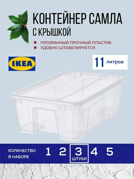 Контейнер для хранения Икеа Самла 11 литров с крышкой- комплект из 3 шт. Самла представляет собой практичный и функциональный аксессуар для организации пространства. Изготовленный из прозрачного полипропилена, он обеспечивает легкий обзор содержимого, что позволяет быстро находить нужные вещи. Прозрачность контейнера позволяет легко найти нужный предмет, а также обеспечивает визуальное восприятие порядка и организованности пространства. Крышка контейнера надежно защищает содержимое от пыли, грязи и влаги, что делает его незаменимым помощником в хранении спортивного инвентаря, садовых инструментов или аксессуаров для уборки. Пластиковый контейнер имеет прямоугольную форму и размеры 39х28х14 см, что позволяет разместить в нем большое количество предметов. Контейнер Икеа Самла подходит для использования только в помещении, так как не предназначен для использования на улице. Контейнер для хранения с крышкой изготовлен из полипропилена, который является прочным и долговечным материалом, устойчивым к воздействию влаги и температурным колебаниям. Ящик для хранения Икеа Самла 11 литра с крышкой – это не только практичный, но и экологически безопасный выбор. Пригодно для переработки или энергетической утилизации, если это предусмотрено в вашем регионе.