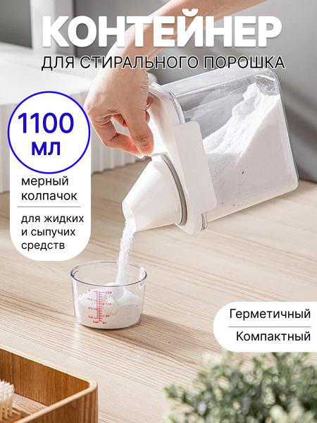 Контейнер для хранения стирального порошка объемом 1100 мл представляет собой удобный и практичный органайзер, который станет незаменимым помощником в вашем доме. Изготовленный из высококачественного пластика, он гарантирует долговечность и надежность. Прозрачный корпус контейнера с крышкой позволяет видеть содержимое, что облегчает выбор необходимого средства. Герметичная крышка предотвращает попадание влаги, обеспечивая сохранность порошка. Крышка надежно фиксирует органайзер, предотвращая случайное открывание. Контейнер также можно использовать для хранения корма для домашних животных, муки и других сыпучих продуктов, что делает его многофункциональным и практичным решением для вашего дома. В комплекте с контейнером идет мерный стаканчик объемом 150мл, который облегчает процесс дозирования порошка для стирки и других бытовых средств. Удобный носик на контейнере для жидкого порошка обеспечивает удобство применения и не позволяет средству разлиться или рассыпаться при использовании. Контейнер для порошка легко моется под проточной водой или протирается влажной тряпкой. Размеры контейнера составляют 17.5 см в высоту, длина 14 см по крышке и ширина 9.5 см по крышке, что делает его компактным и удобным для хранения в любом уголке вашего дома. Пластиковый контейнер с крышкой - это забота о вашем комфорте и чистоте вокруг вас. Храните гель для стирки аккуратно и удобно.