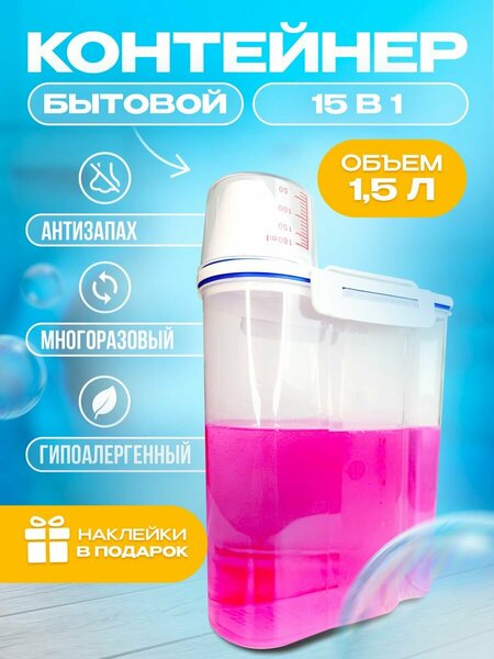 Контейнер для порошка стирального и геля 1,5 литра, станет отличной заменой фабричным упаковкам. С обычными мешками засыпать моющее средство в стиральную машинку - целая проблема. Все постоянно просыпается, да и держать тяжелую упаковку не совсем удобно. Большой пластиковый контейнер же имеет специальный носик - с его помощью сыпучие продукты аккуратно пересыпаются в отсек. А ручка позволяет брать емкость одной рукой. Емкость для хранения из прочного пластика имеет герметичную крышку с защелкой - это значит, что вы можете хранить в ней не только сыпучие продукты, но и использовать для геля для стирки или для кондиционера для белья. На крышке предусмотрена специальная разметка. Теперь вам не нужно искать мерный стакан, чтобы отмерить нужное количество моющего средства. Такая баночка для порошка занимает меньше места по сравнению с обычными упаковками, поэтому подойдет даже для самых маленьких ванных комнат. Контейнер подходит для любых видов сыпучих и жидких средств, будь то бытовая химия либо лубые другие сыпучие продукты. Органайзер для хранения идеально подойдет для хранения нужных вам средств как на кухне так и вваной комнате. Банка для хранения в ванной имеет минималистичный дизайн и не создает визуального шума. Емкость для стирального порошка не только отлично впишется в интерьер, но и украсит его. Контейнер универсальный и многоразовый так же легко моется и не окрашивается и не впитывает запахи используемых ранее средств. В ассортименте представлены контейнеры в двух размерах - выберите тот, который подходит именно вам.