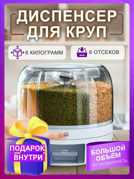 Контейнер для круп идеально впишется в интерьер вашей кухни. Диспенсер заменит вам целый набор посуды для хранения продуктов. Стеклянные баночки и вакуумные пакеты, а также наборы герметичных контейнеров , коробочки и другие емкости для хранения сухих продуктов питания больше не пригодятся. Контейнер имеет большие отсеки, каждый вместительностью до 700 гр крупы. Благодаря прозрачным стенкам отсеков и удобной кнопке - дозатору вы с легкостью отмерите необходимое количество крупы в выдвижной мерный контейнер. Органайзер для круп выполнен из качественного пластика, что исключает посторонние запахи. Контейнер для сыпучих продуктов вращается на 360 градусов для максимального комфорта в использовании. Сверху органайзер для крупы закрывается плотной крышкой, что предотвращает попадание в него влаги и пыли. В центре емкости для хранения сыпучих продуктов имеется специальный отсек, в который можно положить природные средства защиты от насекомых (чеснок, гвоздику, лавровый лист, анис). Диспенсер из полимеров - недорогой универсальный кухонный инвентарь. Органайзер выполнен из экологически чистого пищевого пластика. Контейнеры для круп подойдут как для дачи, так и для городской квартиры. Эстетичные кухонные приспособления всегда радуют глаз. Подарочный набор в виде ёмкости под сыпучие продукты отличный подарок для мамы, для любимой, для сестры, для бабушки, для подруги, для коллеги и для себя любимой, на 14 февраля, на 8 марта, на день рождения, на новоселье, на свадьбу, на Новый год и просто так. Диспенсер для круп прекрасно помогает в организации пространства. Контейнер для хранения круп можно расположить на столе или в шкафу. Крупы требуют особых условий хранения и органайзер для круп отлично справляется с этой задачей. Контейнер для крупы не скользит на поверхностях, поэтому нет необходимости ставить его на подставку или коврик. Контейнер для хранения круп обязательно порадует каждого и станет не только декоративным украшением любого дома, но и функциональным бытовым аксессуаром. Контейнер идеально подойдет даже для маленькой кухни. Мы не рекомендуем хранить в ёмкости для круп макаронные изделия, геркулес, муку, сахар, соль, соду, растворимый кофе, чай, какао, готовые смеси для выпечки или корм, т. к. механизм подачи в контейнере не предусмотрен для этого. Органайзер для круп не требует особенного ухода и чистки специальными средствами, его достаточно своевременно протирать от загрязнений. Это легко можно сделать при помощи влажной губки или ветоши, при необходимости можно добавить немного моющего средства. При желании контейнер можно промыть под струей воды. Это удобно сделать в раковине или в ванне, при помощи душа. Мы не рекомендуем мыть его в посудомоечной машине, так как это может нарушить внешний вид контейнера или нанести повреждения. Органайзер для круп приходит в собранном виде. Он надежно упакован в двойную пупырчатую пленку, и установлен в картонный ящик, который в свою очередь дополнительно защищена бопп пакетом. Все это обеспечит целостность диспенсера для сыпучих продуктов. Товары для кухни всегда пригодятся в быту. Контейнер для круп купить вы сможете у нас по привлекательной цене, и он обязательно станет вашим любимым кухонным помощником.