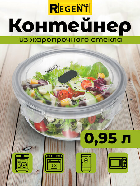 Стеклянный герметичный контейнер Regent inox для хранения продуктов 0,95 л 7 в 1: - хранение пищи в холодильнике - хранение сыпучих продуктов при комнатной температуре - глубокая заморозка - использование в микроволновой печи - приготовление пищи в духовом шкафу при высоких температурах - сервировка - транспортировка Пищевое боросиликатное стекло, из которого изготовлена емкость, отличается высокой прочностью и экологичностью. Такое стекло не выделяет вредных веществ при нагреве. Контейнер не впитывает запахи и не окрашивается от продуктов, обеспечивает долгую сохранность свежести продуктов. Ланч бокс полностью герметичен, благодаря силиконовым вставкам и специальным клипсам на крышке. Воздушный клапан на крышке предотвращает образования конденсата и помогает легко видеть, что находиться внутри контейнера. Пластиковая крышка оснащена дополнительными "крылышками" для защиты края контейнера. Внимание! • Температурные режим использования -20℃ +500℃ • Максимальный температурный шок -10℃ +100℃ • Можно ставит на открытый огонь только с жидкостью • При приготовлении и разогреве пищи в духовом шкафу необходимо снимать крышку с контейнера • При использование контейнера с крышкой в микроволновой печи необходимо открыть клипсы • Не допускайте соприкосновения нагретого изделия с мокрыми, холодными поверхностями Уход: • Тщательно мойте изделие после использования • Не используйте абразивные моющие средства для ухода за крышкой контейнера • После мытья вытирайте насухо • Можно мыть в посудомоечной машине