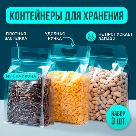 Представляем вам набор контейнеров для сыпучих продуктов и заморозки размером 24х30 см с зип застежкой. Эти удобные зип пакеты являются незаменимыми элементами на кухне при организации хранения продуктов. Набор включает в себя 3 пакета с застежкой, которые идеально подходят для упаковки и хранения различных продуктов питания. Контейнеры для сыпучих продуктов предназначены для хранения продуктов как дома, так и в путешествиях. Они являются удобными и герметичными, позволяют сохранять свежесть и вкус продуктов на протяжении длительного времени. Контейнер для хранения сыпучих продуктов прозрачный, что позволяет видеть содержимое и предотвращать попадание света. Контейнеры для хранения продуктов с застежкой выполнены из высококачественного пищевого материала, который является безопасным для контакта с пищей и не содержит вредных веществ. Контейнеры - пакеты прочные, гибкие и долговечные, что позволяет использовать их многократно без потери своих свойств. Контейнеры обеспечивают надежный захват и герметичность, предотвращая утечку жидкости или запаха. Контейнер для сыпучих продуктов идеально подходят для хранения различных продуктов. Вы можете использовать их для упаковки овощей, фруктов, круп и других сыпучих продуктов. Контейнеры для хранения продуктов можно использовать в качестве ланч боксов для хранения печенья, салатиков, бутербродов и других закусок на пикник или завтрак. Контейнер для овощей удобно помещается в холодильнике или морозильной камере, что позволяет вам легко организовать пространство и сохранить продукты свежими. Контейнер для хранения сыпучих продуктов обладает удобной застежкой, которая обеспечивает герметичность и удобство использования. Вы сможете легко открыть и закрыть контейнер для сыпучих продуктов с помощью замка-застежки, что позволит сохранить свежесть и аромат продуктов. Контейнеры для круп компактные и многоразовые, что делает их идеальными для организации хранения продуктов и для экологически осознанного образа жизни. Набор контейнеров для хранения продуктов можно использовать как пакеты для заморозки, в них можно переносить жидкость. Зип пакеты для заморозки можно мыть в посудомоечной машине.