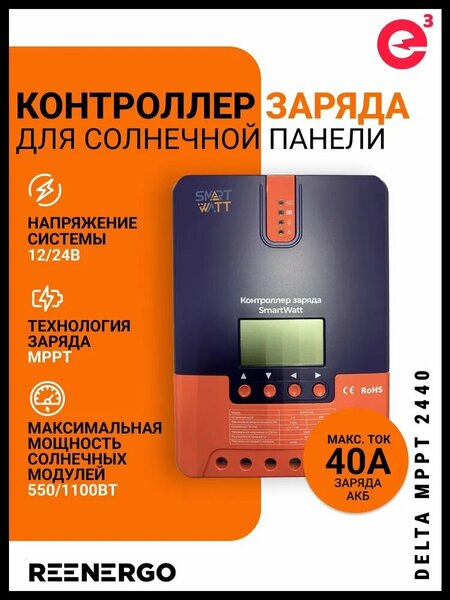 Delta SmartWatt 2440 – это солнечный контроллер заряда c технологией слежения за точкой максимальной мощности солнечных панелей (MPPT), которая позволяет получать до 30% дополнительной энергии от ваших солнечных батарей по сравнению с ШИМ контроллерами. Данный контроллер заряда идеально подходит для использования в солнечных электростанциях малой и средней мощности с током заряда до 40А и напряжением аккумуляторных батарей 12 или 24В. Контроллер SmartWatt MPPT 2440 оснащён большим алюминиевым радиатором, на всю площадь тыльной поверхности, что позволяет контроллеру отводить тепло даже в самых экстремальных условиях, а функция ограничения зарядного тока не даст контроллеру выйти из строя даже если контроллер сильно перегружен по мощности солнечных батарей. Контроллеры Delta MPPT 2440 имеет встроенный ЖК-дисплей для настройки параметров солнечной электростанции и выбора типа аккумуляторных батарей. Продвинутый алгоритм заряда MPPT, мгновенно адаптируется под любые погодные условия и делает генерацию солнечной энергии эффективней аналогов, тем самым увеличивая продолжительность работы батареи и повышая производительность системы. Комплексная самодиагностика и электронные функции защиты исключают поломки в результате не правильной установки и нештатных режимов работы системы. Полный перечень электронной защиты обеспечивает первоклассную надежность и долгий срок службы контроллера. Особенности контроллера SmartWatt MPPT 2440: – Продвинутая MPPT технология с супер быстрым поиском точки макс. мощности – Макс. эффективность заряда до 99% – генерация энергии с минимальными потерями – Многофункциональный ЖК-дисплей – Широкий диапазон отслеживания точки максимальной мощности (MPP) – Функция ограничения зарядного тока, даже при перегрузке контроллера СБ – Поддержка 4-х видов АКБ: Sealed, Gel, Flooded and User – 3-х ступенчатый алгоритм заряда – Функция температурной компенсации – Совместим с выносным температурным датчиком