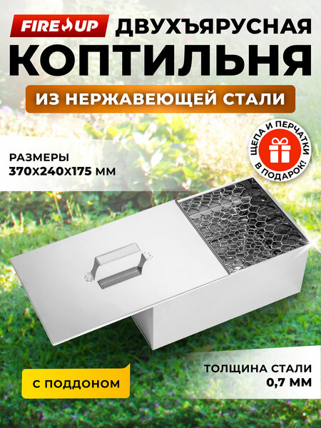 Готовить мясо на огне можно не только с помощью мангала. Копчение придает продуктам особый вкус. Двухъярусная коптильня из нержавеющей стали справляется с этой задачей. В ней можно коптить мясо, рыбу, сосиски, сыр, овощи и другие продукты. Любителям выездов на природу удобно возить изделие в багажнике автомобиля – много места не займет. Отличительной особенностью изделия является небольшой вес. Он составляет около 3 кг, что позволяет брать коптильню даже в пешие походы. В процессе приготовления продуктам можно придавать разные ароматы. Для этого используют щепу различных деревьев. Ее обычно покупают готовую в пакетах. При копчении используют щепу ольхи, вишни, яблони, груши, клена и других пород деревьев. Коптильня вместительная, а два яруса решеток позволяют приготовить больше продуктов за один раз. На дно укладывают щепу. Затем устанавливают решетки, на которые укладывают продукты. Чтобы щепа лучше тлела, ее слегка увлажняют водой. Далее коптильню ставят над горячими углями и через 30-40 мин снимают с приготовленными копчеными продуктами. Коптильня, включая решетки и поддон, изготовлена из нержавеющей стали AISI 430. Стенки имеют толщину 0,7 мм. Габариты изделия: длина – 370 мм, ширина – 240 мм и высота – 175 мм. Вес 2290 г. Чтобы коптильню удобно было переносить с одного места на другое, она оснащена удобной ручкой. Решетки расположены так, что можно коптить продукты сразу на двух уровнях и спокойно выдерживает 3 кг. Дым и тепло будут равномерно поступать со всех сторон. На дне емкости установлен поддон на ножках для сбора жира. В процессе приготовления жир стекает в него, не попадая при этом на тлеющую щепу. Удобная крышка-слайдер с ручкой позволяет плотно закрыть коптильню, чтобы удержать дым, и быстро открыть при необходимости. Коптильня подойдет для использования как дома, так и на природе. Ее можно брать с собой на охоту или на рыбалку. Пойманную рыбу или дичь легко приготовить с помощью коптильни и насладиться вкусным блюдом.