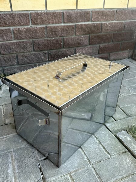 Коптильня двухуровневая ручной работы 40х25х25 см. из нержавеющей стали AISI 430, толщиной 1,5 мм, это идеальный помощник для копчения мясных блюд или рыбы на природе, даче и даже в квартире, т. к. наша коптильня оборудована гидрозатвором! Наши коптильни имеют гнутое дно, что обеспечивает большую прочность и долговечность! В комплект входит поддон, решетка 2 уровня, гидрозавтор, щепа в подарок.