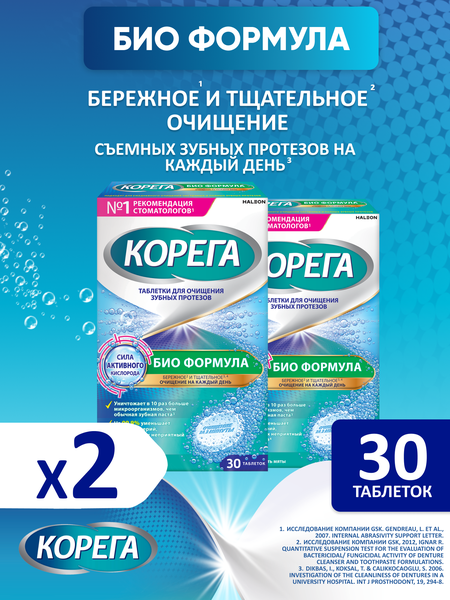 Корега Био Формула — таблетки для очищения съёмных зубных протезов Чувствуйте себя уверенно в течение всего дня — общайтесь, улыбайтесь и наслаждайтесь едой, а средство Корега позаботится о вашем съёмном зубном протезе. Таблетки Корега Био Формула обеспечивают безопасное, бережное и глубокое очищение, помогая удалять налёт и стойкие пятна, а также дарят ощущение свежести благодаря экстракту мяты. Преимущества таблеток для ухода за зубными протезами Корега: ✔ На 99,9% уменьшают число бактерий, вызывающих неприятный запах* ✔ Очищают протез всего за 3 минуты, а для стерилизации можно оставить на ночь ✔ Разрушают бактериальную биоплёнку, эффективно удаляя микроорганизмы даже в труднодоступных местах ✔ Подходят для частичных и полных зубных протезов ✔ Бережно очищают и не царапают благодаря неабразивной формуле** ✔ Обеспечивают свежее дыхание, делая общение более комфортным Способ применения: 1. Очистите протез от остатков пищи щёткой. 2. Растворите 1 таблетку в стакане тёплой воды. 3. Погрузите протез в раствор: ● 3 минуты — для быстрого очищения, ● 10–15 минут — для более тщательного ухода, ● на ночь — для глубокой стерилизации. 4. Промойте протез проточной водой и просушите салфеткой. Количество таблеток в упаковке: 30 штук. Для надёжной фиксации протеза дополнительно используйте кремы Корега для зубных протезов — они уменьшают попадание пищи под протез и предотвращают раздражение дёсен. Ухаживайте за протезом правильно, чтобы чувствовать себя комфортно в любой ситуации — смело улыбайтесь, общайтесь и наслаждайтесь любимой едой без ограничений! *При замачивании, по результатам лабораторных исследований. Оценка антимикробной эффективности средства для чистки зубных протезов. Обзор компании ГСК, 2012. **Обоснование свойств по отсутствию абразивных частиц в составе средств для очистки зубных протезов Корега. Обзор компании ГСК, 2007.