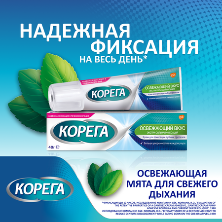 Надежная фиксация зубного протеза придаст вам уверенности и позволит заботиться о более важных вещах. Крем для фиксации зубных протезов Корега Освежающий вкус повышает качество жизни людей, использующих зубные протезы:Предотвращает попадение частичек пищи под протез за счет всесторонней фиксации.Крем фиксирует зубной протез на целый день, позволяя вам забыть о дискомфорте в течение 12 часов.Освежает дыхание за счет мятного вкусаНе содержит цинк.