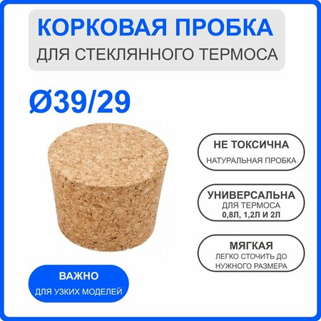 Корковая пробка прессованная подходит для стеклянного термоса 1,2 и 2 литра. Пробка для термосов с колбой из стекла, глухая, изготовлена из прессованной корковой древесины (агломерированной корки). Материал: агломерированная корка (прессованная кора пробкового дерева) Вес, грамм: 10, Размеры (верх х низ х высота), мм: 39 х 29 х 35 Пробка рассчитана на термосы со стеклянной колбой 1,2 и 2 литра, идеально подходит для старых советских и китайских термосов. Пробка имеет конусообразную форму, отлично вставляется в горловину термоса. Материал пробки податливый и мягкий, отлично поддаётся обработке, при желании можно легко сточить до требуемого размера.