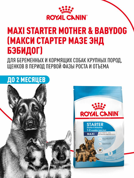 Корм сухой полнорационный для собак крупных пород (весом от 26 до 44 кг) в конце беременности и в период лактации, а также для щенков в период отъема от матери и до 2-х месячного возраста MAXI STARTER MOTHER & BABYDOG 1-2 months (МАКСИ СТАРТЕР МАЗЕ ЭНД БЭБИДОГ 1-2 месяца) подходящий для щенков крупных пород в конце беременности и в период лактации в возрасте от 1 до 2 месяцев, специально разработан с учетом потребностей вашего щенка в питательных веществах в период роста. Формула сухого продукта Роял Канин облегчает процесс отъема, а также поддерживает здоровье матери и щенков, иммунитет, развитие мозга и микрофлору кишечника. Поскольку иммунная система вашего щенка развивается постепенно, корм содержит эффективный комплекс антиоксидантов, включая витамины С и Е. Продукт Royal Canin Maxi Starter Mother & Babydog (Макси Стартер Мазе Энд Бэбидог) разработан с учетом потребностей в питательных веществах беременных и кормящих собак, новорожденных щенков. Эта формула подходит для взрослых крупных собак в период беременности и лактации весом от 26 до 44 кг, а также для щенков в возрасте до 2 месяцев. Благодаря сочетанию полезных пребиотиков и легкоусвояемых белков (L. I. P.*) формула помогает поддерживать баланс микрофлоры кишечника, способствуя здоровому пищеварению. Гранулы легко размачиваются до консистенции каши и обладают высокой вкусовой привлекательностью для щенков в период отъема. Через 8 недель потребности вашего щенка в питательных веществах изменятся. Ему будет необходим другой рацион, разработанный специально для следующей фазы роста. В этом возрасте вы сможете перевести своего щенка на корм Royal Canin Maxi Puppy (Макси Паппи). Масса нетто: 15 кг *L. I. P: источники белков с высокой степенью усвояемости.
