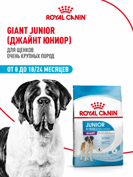 Корм сухой полнорационный для щенков очень крупных пород (вес взрослой собаки более 45 кг) в возрасте от 8 до 18/24 месяцев GIANT JUNIOR 8-18/24 months (джайнт юниор 8-18/24 месяца) ROYAL CANIN®, специально разработан с учетом потребностей вашего щенка в питательных веществах в период роста. Формула сухого продукта роял канин джайнт юниор для больших пород поддерживает иммунитет, гармоничное развитие в длительный период роста, развитие мышечной массы и микрофлору кишечника. Поскольку иммунная система вашего щенка развивается постепенно, корм содержит синергичный комплекс антиоксидантов, включая витамины С и Е, для поддержания естественной защиты в период формирования иммунной системы. Оптимальное количество высококачественного белка обеспечивает набор мышечной массы в возрасте от 8 до 18/24 месяцев. Сочетание пребиотиков и легкоусвояемых белков (L. I. P.*) поддерживает баланс микрофлоры кишечника, способствуя здоровью пищеварительной системы. Специально разработанные гранулы продукта подходят для очень крупных челюстей щенков и облегчают процесс захватывания и разгрызания корма. Масса нетто: 15 кг *L. I. P: источники белков с высокой степенью усвояемости.