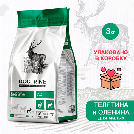 Корм дополнительно упакован В прочную картонную коробку для сохранности товара при транспортировке! Производство Россия. Суперпремиальный беззерновой рацион Doctrine для взрослых собак с телятиной и олениной. Doctrine для взрослых собак малых пород — это экспертный рацион, максимально приближенный к натуральному питанию. Мы приготовили свой суперпремиальный продукт из мяса и картофеля, без добавления зерна, поэтому в нашем составе нет глютена. Овощи в рационе способствуют комфортному пищеварению питомца, а брусника и комплекс витаминов отвечают за здоровое сердце и сильный иммунитет. С рационом Doctrine вы можете быть уверены, что сердце и сосуды маленького друга под надежной защитой, кости и зубы укреплены, кожа и шерсть в идеальном состоянии. Содержит 60% животного белка. Здоровье начинается с питания! Дегидрированное мясо теленка 26%, сушеный картофель, дробленый зеленый горошек, гидролизированное мясо оленя 8%, куриный жир (источник Омега-3, Омега-6), гидролизованная куриная печень, витаминно-минеральный комплекс, пивные дрожжи (источник маннанолигосахаридов и витамина В12), сухая пульпа сахарной свеклы (натуральный пребиотик), льняное семя, лососевый жир (источник витаминов А, D), высушенное цельное яйцо, ламинария (источник йода и витаминов РР), сушеная брусника (источник витамина С), куркума (источник железа и кальция), экстракт бархатцев прямостоячих (источник провитамина А), сушеный цикорий (натуральный источник пребиотика инулин), глюкозамин из животных тканей, сульфат хондроитина, юкка Шидигера.