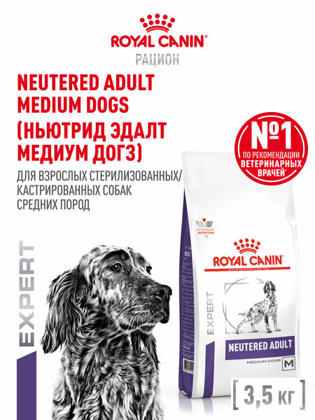 Сухой корм ROYAL CANIN® NEUTERED ADULT MEDIUM DOGS (НЬЮТРИД ЭДАЛТ МЕДИУМ ДОГЗ) полнорационный корм для стерилизованных взрослых собак средних пород (от 11 до 25 кг) или склонных к набору веса - Старше 12 месяцев. Формула помогает поддерживать оптимальный вес у взрослых кастрированных\стерилизованных собак за счет умеренного содержания жиров и сочетания различных типов клетчатки, обеспечивающей быстрое насыщение и длительное чувство сытости.