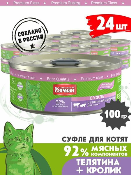 Корм для котят "Четвероногий Гурман" "Суфле c телятиной и кроликом" - это влажный корм премиум класса, приготовленный по уникальной рецептуре из самых привлекательных для кошек видов мяса и субпродуктов. Главная отличительная особенность данной линейки - нежнейшая воздушная текстура, которая придется по вкусу самым привередливым котятам. Корм полностью натуральный - в его составе нет искусственных красителей, ароматизаторов, усилителей вкуса и ГМО. Питательная ценность (в 100 г продукта): протеин - 9 г, жир - 5 г, клетчатка - 0,5 г, зола - 2 г, таурин - 0,2 г, влага - 85 г. Витамины (в 100 г продукта): А - 561 МЕ, Е - 0,1 МЕ, В1 - 0,03 мг, В2 - 0,14 мг, В3 - 1,8 мг, B4 - 33,1 мг, В5 - 0,48 мг, В6 - 0,07 мг, B12 - 0,01 мг. Энергетическая ценность (в 100 г продукта): 81 ккал. Рекомендации по кормлению: 80 - 95 г на 1 кг веса животного. Суточную норму разделить на два приема кормления. Употреблять при комнатной температуре. Подходит для любых пород кошек: персидская кошка, мейн-кун, сибирская порода, невская маскарадная, бенгальская, абиссинская, британская короткошерстная, шотландская вислоухая, сфинкс и др. Количество штук в упаковке: 24. Вес: 0.1 кг. Основной ингредиент: мясо. Возраст животного: котята (до 1 года). Текстура: кусочки в желе. Тип упаковки: консервная банка. Класс корма: премиум. Состав: субпродукты куриные, телятина, кролик, плазма крови, животный белок, вода, желирующая добавка, аминокислоты (таурин, глицин), краситель натуральный карамель, соль. Минеральные вещества: P - 68 мг, Ca - 12 мг, Na - 152 мг, Cl - 157 мг, K - 56 мг, Mg - 3 мг, Fe - 6 мг, Zn– 0,5 мг,