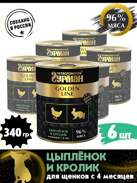 Четвероногий Гурман "Golden line Цыпленок и кролик в желе" – это влажный корм суперпремиум класса для щенков, приготовленный из мяса качества Human grade (пригодного в пищу человеку). В составе отсутствуют искусственные красители, ароматизаторы, усилители вкуса и ГМО. Открыв баночку, вы увидите мелко нарезанное сочное филе курицы и кролика. Корм содержит 96% настоящего мяса в ароматном желе. В составе также присутствуют натуральный витаминно-минеральный комплекс и юкка шидигера, которая способствует улучшению пищеварения и поддержанию иммунитета. Корм подходит для щенков всех пород с 4 месяцев и рекомендован для употребления при комнатной температуре. Суточная норма составляет 50-70 г на 1 кг веса животного в 2-3 приёма кормления. Корм "Golden line Цыпленок и кролик в желе" упакован в консервные банки по 340 г, в комплекте 6 штук. Храните при температуре от 0`С до +25`С. Выбирайте Четвероногий Гурман "Golden line Цыпленок и кролик в желе" для здорового и сбалансированного питания вашего щенка!