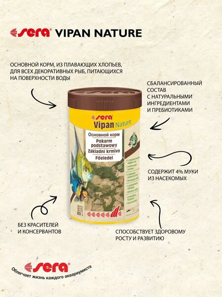 Корм Sera Vipan Nature сухой в хлопьях для всех декоративных рыб, 250 мл, 60 гр