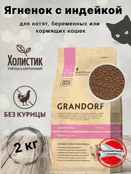 Корм сухой для кошек GRANDORF Ягнёнок с индейкой (рис) Kitten 2кг. Для котят в возрасте от 3 недель, беременных и кормящих кошек. С пробиотиками, низкозерновой.