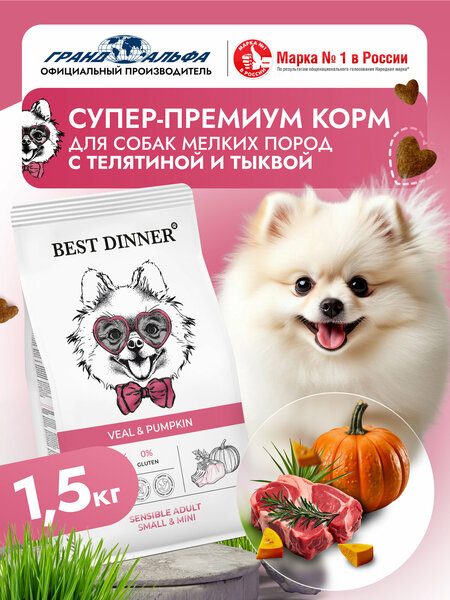 Корм сухой для собак мелких, мини, карликовых пород супер премиум класса с телятина и тыква при чувствительном пищеварении, 1,5 кг Best Dinner (Бест Диннер)