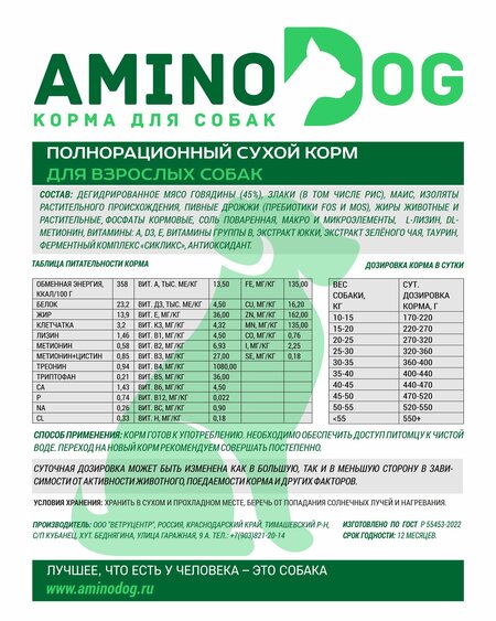 Корм для взрослых собак мелких и средних пород AminoDog является идеальным выбором для поддержания здоровья и активности вашего питомца на протяжении всей его жизни. Сбалансированный состав корма обеспечивает организм собаки всеми необходимыми питательными веществами, витаминами и минералами, что способствует поддержанию нормального функционирования всех систем и органов. Одним из главных преимуществ корма AminoDog является наличие высококачественного белка, который необходим для поддержания и укрепления мышечной массы, а также для обеспечения энергией вашего питомца. Белок также играет важную роль в процессе роста и развития молодого организма собаки, а также в восстановлении клеток после физических нагрузок. Внешний вид: круглая гранула, диаметром 8-10 мм. Состав: дегидрированное мясо говядины (45 %), злаки (в том числе рис), маис, изоляты растительного происхождения, пивные дрожжи (пребиотики FOS и MOS), жиры животные и растительные, фосфаты кормовые, соль поваренная, макро- и микроэлементы, L-лизин, DL-метионин, витамины: А, Д3, Е, витамины группы В, экстракт юкки, экстракт зелёного чая, таурин, ферментный комплекс "сикликс", антиоксидант. Питательность: Белок - 23,2 % Жир - 13,9 % Клетчатка - 3,2 % Лизин - 1,46 % Метионин - 0,85 % Са - 1,43 % Р - 0,74 % Все это делает корм для взрослых собак AminoDog отличным выбором для тех, кто заботится о здоровье и благополучии своего питомца. Способ применения: корм готов к употреблению, не забывайте также обеспечивать доступ к свежей воде для вашего питомца во время кормления сухим кормом, чтобы поддерживать оптимальный водный баланс в организме собаки. Переход на новый корм рекомендуем совершать постепенно. Дозировка корма в сутки приведена в таблице и может быть изменена как в большую так и в меньшую сторону в зависимости от активности животного, поедаемости корма и других факторов. Условия хранения: срок годности 12 месяцев. Хранить в сухом и прохладном месте, беречь от попадания солнечных лучей и нагревания. Упаковка: белый мешок с этикеткой. Масса нетто: 10 кг Произведено по ГОСТ Р - 55453-2022