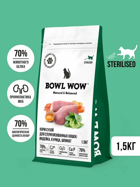 Корм сухой BOWL WOW для стерилизованных кошек полнорационный с индейкой, курицей и шпинатом 1.5кг