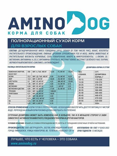 Корм для взрослых собак AminoDog является идеальным выбором для поддержания здоровья и активности вашего питомца на протяжении всей его жизни. Сбалансированный состав корма обеспечивает организм собаки всеми необходимыми питательными веществами, витаминами и минералами, что способствует поддержанию нормального функционирования всех систем и органов. Одним из главных преимуществ корма AminoDog является наличие высококачественного белка, который необходим для поддержания и укрепления мышечной массы, а также для обеспечения энергией вашего питомца. Белок также играет важную роль в процессе роста и развития молодого организма собаки, а также в восстановлении клеток после физических нагрузок. Внешний вид: круглая гранула, диаметром 18-20 мм. Состав: дегидрированное мясо говядины (45 %), злаки (в том числе рис), маис, изоляты растительного происхождения, пивные дрожжи (пребиотики FOS и MOS), жиры животные и растительные, фосфаты кормовые, соль поваренная, макро- и микроэлементы, L-лизин, DL-метионин, витамины: А, Д3, Е, витамины группы В, экстракт юкки, экстракт зелёного чая, таурин, ферментный комплекс "сикликс", антиоксидант. Питательность: Белок - 23,2 % Жир - 13,9 % Клетчатка - 3,2 % Лизин - 1,46 % Метионин - 0,85 % Са - 1,43 % Р - 0,74 % Все это делает корм для взрослых собак AminoDog отличным выбором для тех, кто заботится о здоровье и благополучии своего питомца. Способ применения: корм готов к употреблению, не забывайте также обеспечивать доступ к свежей воде для вашего питомца во время кормления сухим кормом, чтобы поддерживать оптимальный водный баланс в организме собаки. Переход на новый корм рекомендуем совершать постепенно. Дозировка корма в сутки приведена в таблице и может быть изменена как в большую так и в меньшую сторону в зависимости от активности животного, поедаемости корма и других факторов. Условия хранения: срок годности 12 месяцев. Хранить в сухом и прохладном месте, беречь от попадания солнечных лучей и нагревания. Упаковка: белый мешок с этикеткой. Масса нетто: 10 кг Произведено по ГОСТ Р - 55453-2022