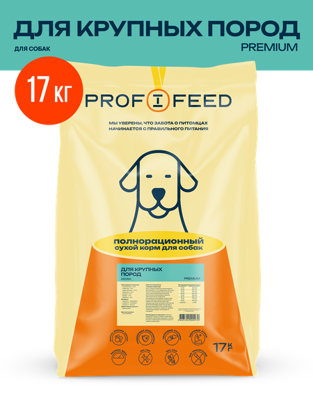 Корм сухой "Profifeed" для собак крупных пород - это полнорационное питание для взрослых питомцев Корм сухой "Profifeed" предназначен для взрослых собак крупных пород и пожилых питомцев старше 7 лет. Он обеспечивает полноценное питание, укрепляет кости и суставы, предотвращает развитие болезней пищеварительной системы и улучшает обмен веществ. Основной ингредиент корма – мясо говядины, которое способствует укреплению костей и суставов, а также предотвращает переутомление и развитие болезней пищеварительной системы. Злаки в составе корма обеспечивают организм макро- и микроэлементами, необходимыми для жизненной энергии. Корм "Profifeed" имеет класс ингредиентов премиум, что гарантирует высокое качество и сбалансированный состав. Энергетическая ценность составляет 365 ккал на 100 грамм продукта. Корм упакован в удобный пакет весом 17 кг, что позволяет долго сохранять свежесть и полезные свойства продукта. В упаковке содержится 1 штука. Корм сухой "Profifeed" подходит для крупных пород собак, а также для питомцев, имеющих особые потребности в здоровье костей и суставов. Корм сухой "Profifeed" для собак крупных пород – это полнорационное питание, которое обеспечивает здоровье и благополучие вашего питомца.