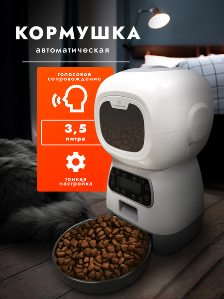 Автоматическая кормушка для животных, автокормушка для кошек и собак, 3.5 литра. Автоматическая кормушка сделана из высококачественного АБС-пластика. Два источника питания: от внешнего источника и от батареи. Кормушка автоматическая на 4 кормления в день подходит для кошек и собак, а так же для других домашних животных. Блок управления сделан в виде робота, нажатием на кнопки вы можете настроить время подачи и количество кормлений, размер порций для кота или собаки, а также записать свой голос. Слыша Ваш голос питомцу будет легче приспособиться к кормушке. Где бы Вы не находились Ваш питомец будет всегда сыт. Автоматическая кормушка для кошек и собак состоит из отсека для корма объемом 3,5 литра и миски. Отсек с кормом легко отделить от корпуса кормушки и помыть водой. Контроль размера порций и частоты кормления, гарантирует защиту от развития ожирения и связанных с ним заболеваний. Кормушка подходит для средних и для мелких домашних животных. Кормушка гармонично вписывается в разные стили интерьера. Минимальный размер гранул 5 мм, максимальный размер гранул 12 мм.