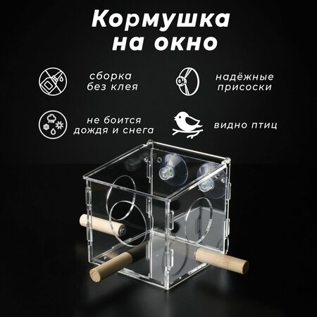 Корпус кормушки из 6 частей, 2 присоски, веревка, якорь, 3 жёрдочки, 3 самореза, пакет с семечками, спиртовая салфетка. Размер корпуса кормушки: 12х12х12 см
